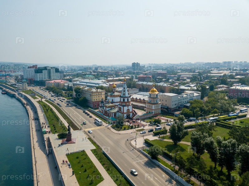 Россия, Иркутск. Центральная набережная города. Река Ангара. Аэрофотоснимок