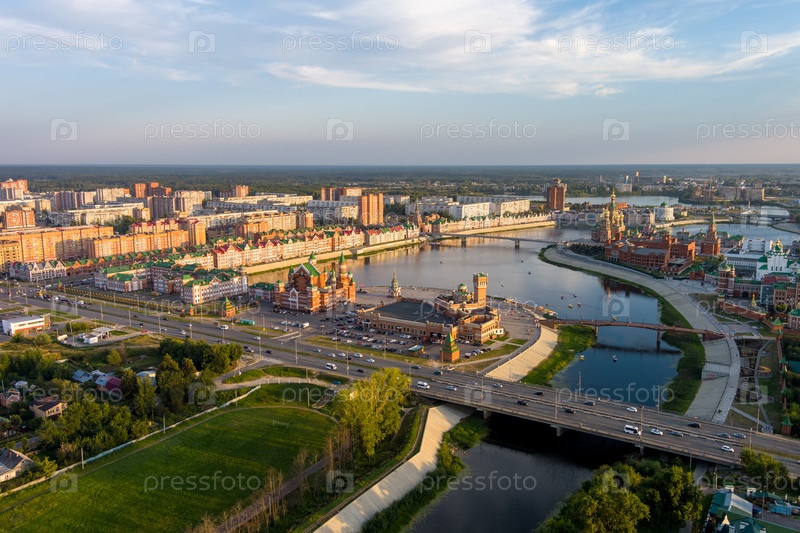 Йошкар-Ола, Россия. Панорама центра города во время заката. С высоты птичьего полета