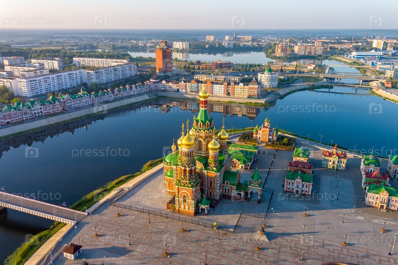 Йошкар-Ола, Россия. Собор Благовещения Пресвятой Богородицы в Йошкар-Оле. Панорама центра города утром. С высоты птичьего полета