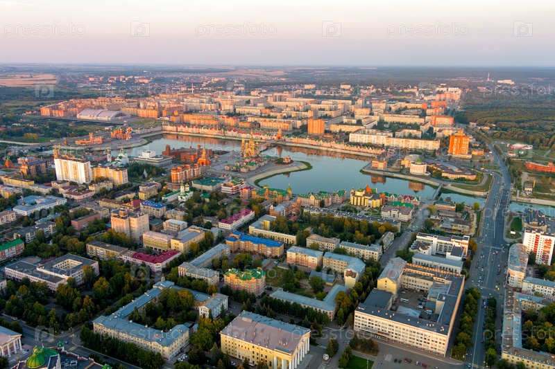 Йошкар-Ола, Россия. Панорама центра города во время заката. С высоты птичьего полета