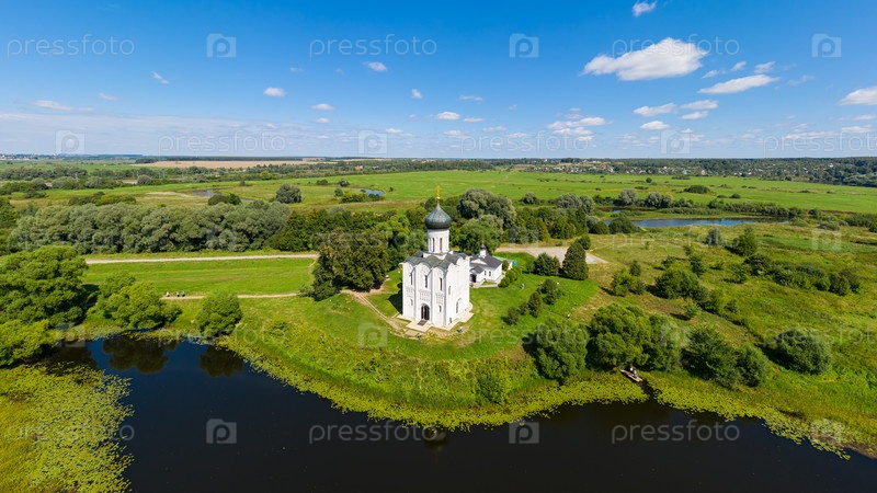 Россия, Боголюбово. Вид с воздуха на церковь Покрова на Нерли. Православная церковь и символ средневековой России
