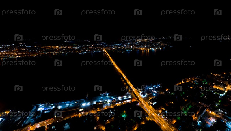 Астрахань, Россия. Аэрофотоснимок ночного города. Астраханский мост. уличные фонари