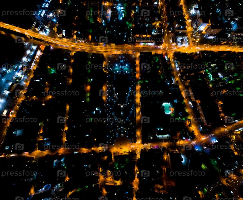 Астрахань, Россия. Аэрофотоснимок ночного города. уличные фонари
