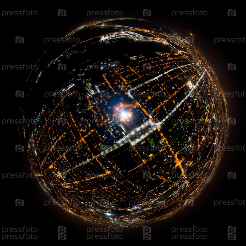 Ростов-на-Дону, Россия. Панорама центральной части Ростова-на-Дону. Ночной вид с воздуха. 360-градусный панорамный астероид