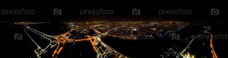 Ростов-на-Дону, Россия. Панорама центральной части Ростова-на-Дону. Ночной вид с воздуха. Панорама 360