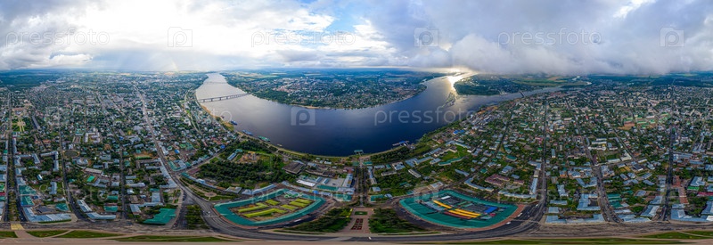Кострома, Россия. Набережная реки Волги, Панорама 360 центра города. С высоты птичьего полета