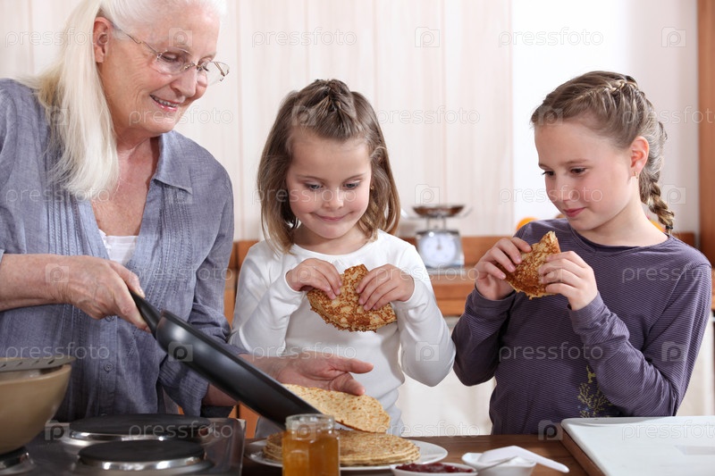 Бабушка печет блины для внучек