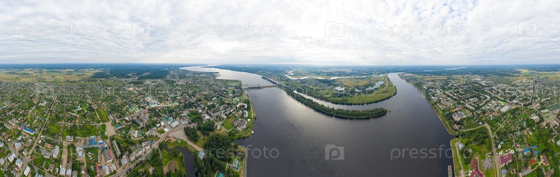 Углич, Россия. Набережная реки Волги, Шлюзовые ворота Угличского водохранилища. Гидроэлектростанция. С высоты птичьего полета. Панорама 360