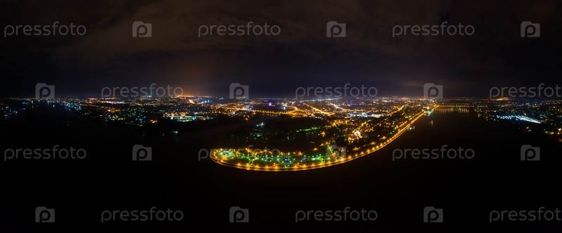 Ярославль, Россия. Панорамный вид на парк «Стрелка». Набережная реки Волги, впадение в реку Которосль. Вид с воздуха ночью