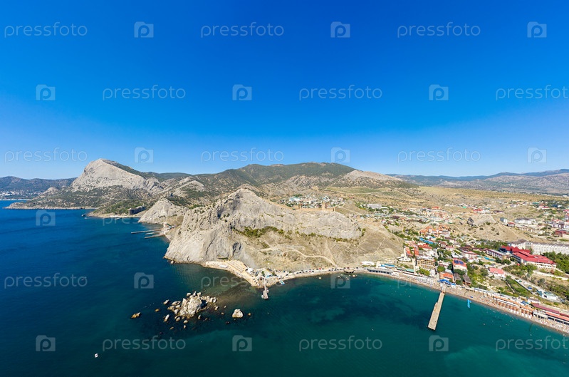 Судак, Крым. Генуэзская крепость. Вид с воздуха с Черного моря. Лето