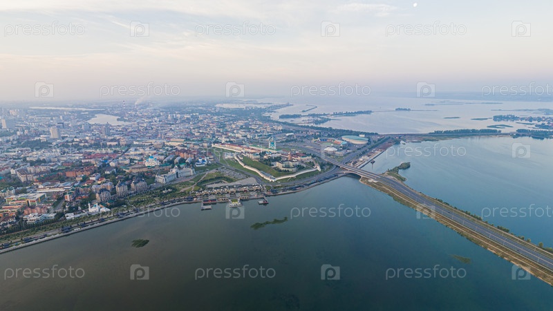 Казань, Россия. Кремль. Вид с воздуха на центральные районы Казани. Полет над рекой Казанка. Панорама