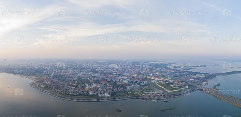 Казань, Россия. Кремль. Вид с воздуха на центральные районы Казани. Полет над рекой Казанка. Панорама