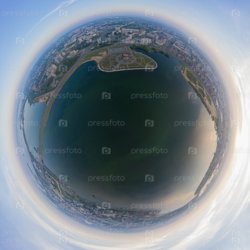 Казань, Россия. Вид с воздуха на центральные районы Казани. Полет над рекой Казанка. 360-градусный панорамный астероид