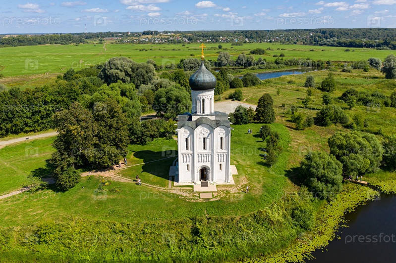 Россия, Боголюбово. Вид с воздуха на церковь Покрова на Нерли. Православная церковь и символ средневековой России