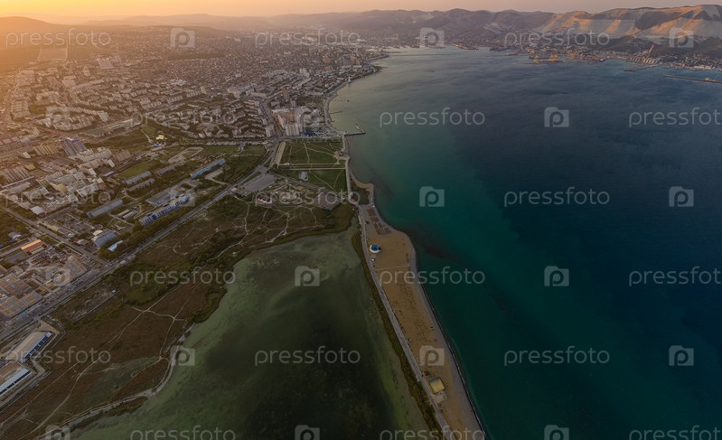 Новороссийск, Россия. Центральная часть города. Суджукская коса. Закат. С высоты птичьего полета