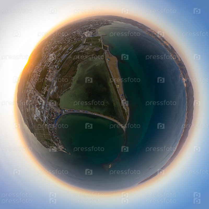 Новороссийск, Россия. Центральная часть города. Суджукская коса. Закат. 360-градусный панорамный астероид