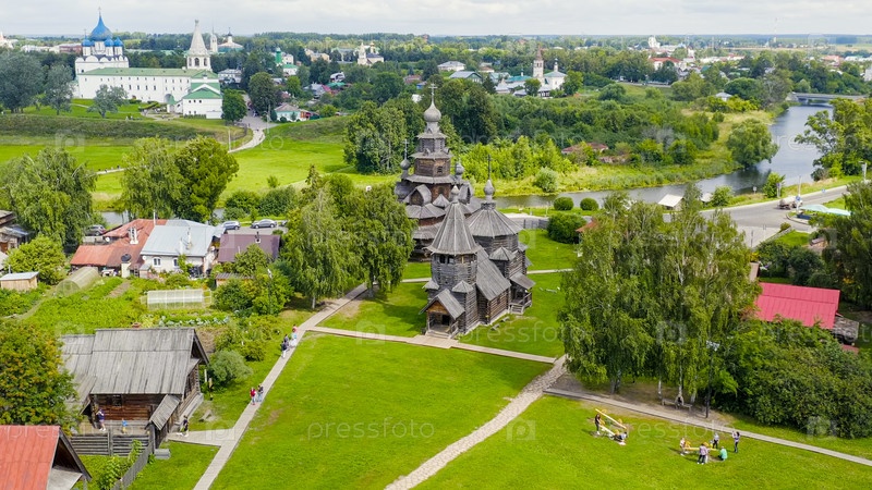Суздаль, Россия. Полет. Деревянные ветряки, Преображенская церковь из села Козлятьево, Воскресенская церковь из села Патакино, Вид с воздуха