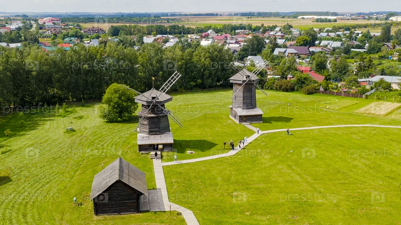 Суздаль, Россия. Полет. Деревянные ветряные мельницы 18-19 веков, вид с воздуха