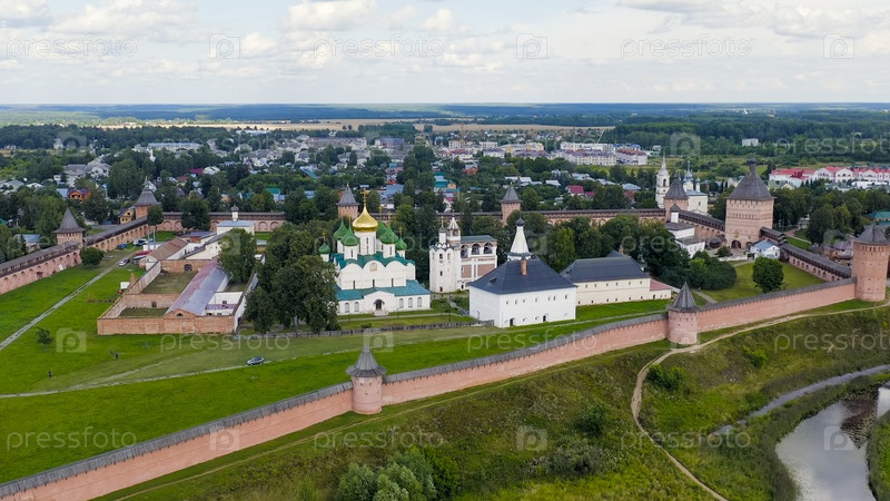 Суздаль, Россия. Полет. Спасо-Евфимиев монастырь. Спасо-Преображенский собор Спасо-Евфимиева монастыря. Колокольня, вид с воздуха