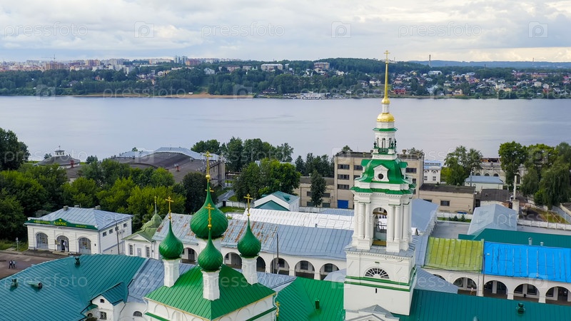 Кострома, Россия. Исторический центр города Костомы. Красные ряды, Спасская церковь в Рядах, вид с воздуха