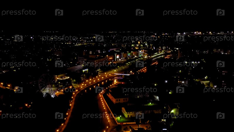 Иваново, Россия - 12 августа 2020 г.: Ночной полет над центром города Иваново, набережная реки Уводь, вид с воздуха
