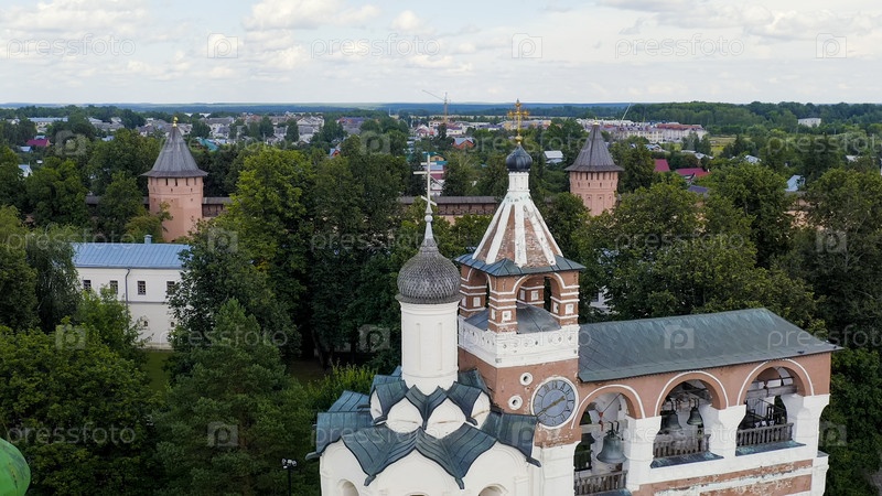 Суздаль, Россия. Полет. Спасо-Евфимиев монастырь. Спасо-Преображенский собор Спасо-Евфимиева монастыря. Колокольня, вид с воздуха