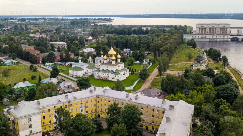 Углич, Россия. Воскресенский монастырь. Мужской монастырь на берегу Волги в Угличе, вид с воздуха