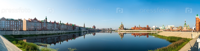Йошкар-Ола, Россия. Панорама центра города. Река Малая Кокшага, набережная Брюгге, Театральный мост, Воскресенская набережная