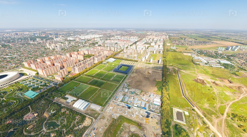 Краснодар, Россия. Панорама города летом. Парк в городе Краснодар. Футбольные площадки. С высоты птичьего полета
