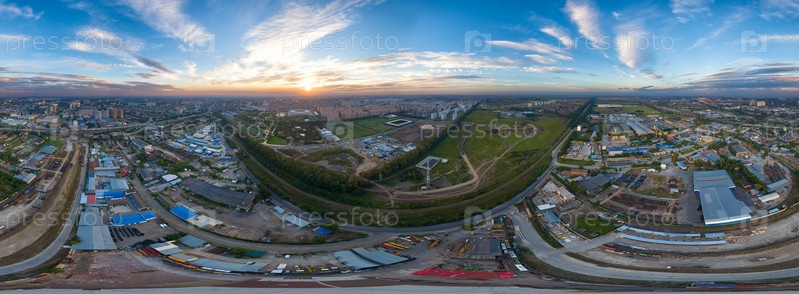 Краснодар, Россия. Панорама города летом. Парк в городе Краснодар. Футбольные площадки. Панорама 360, Закат. С высоты птичьего полета