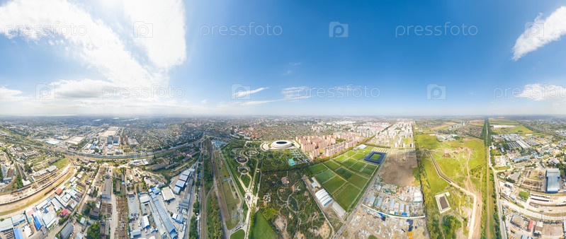Краснодар, Россия. Панорама города летом. Парк в городе Краснодар. Футбольные площадки. Панорама 360, вид с воздуха