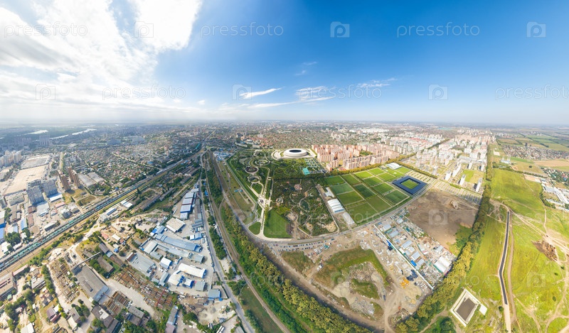 Краснодар, Россия. Панорама города летом. Парк в городе Краснодар. Футбольные площадки. С высоты птичьего полета