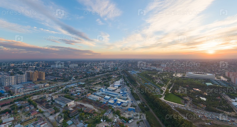 Краснодар, Россия. Панорама города летом. Парк в городе Краснодар. Футбольные площадки. Закат. С высоты птичьего полета