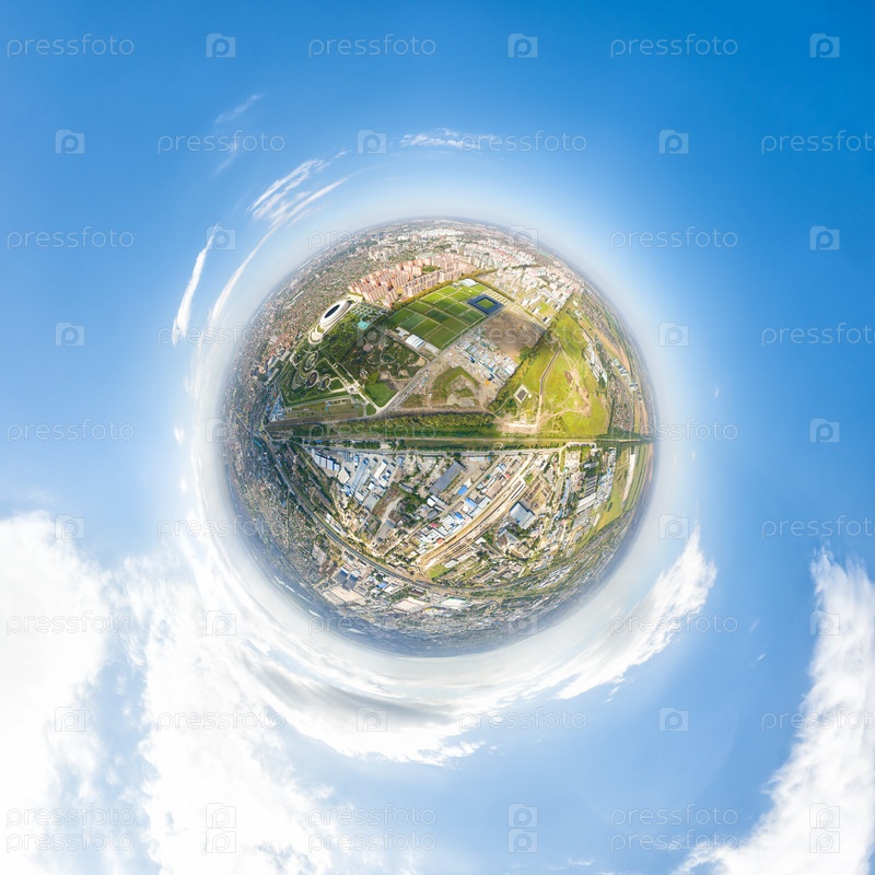 Краснодар, Россия. Панорама города летом. Парк в городе Краснодар. Футбольные площадки. 360-градусный воздушный панорамный астероид