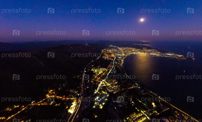 Геленджик, Россия. Вид на ночной город, залив и луну. Лето. С высоты птичьего полета