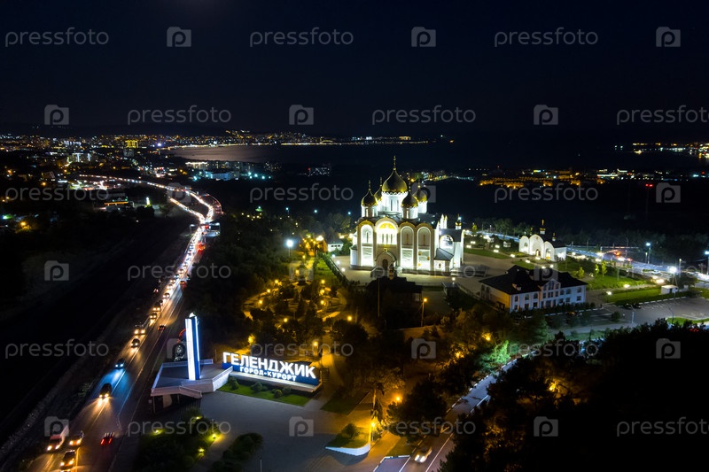 Геленджик, Россия. Собор Андрея Первозванного. Лето. Ночь. Текст на стеле переводится как: Геленжик, город-курорт. С высоты птичьего полета