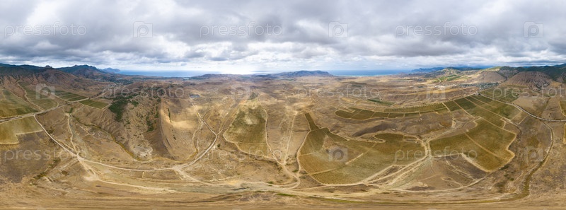 Судак, Крым. Виноградники возле поселка Солнечная Долина. Осень. Панорама 360. Вид с воздуха