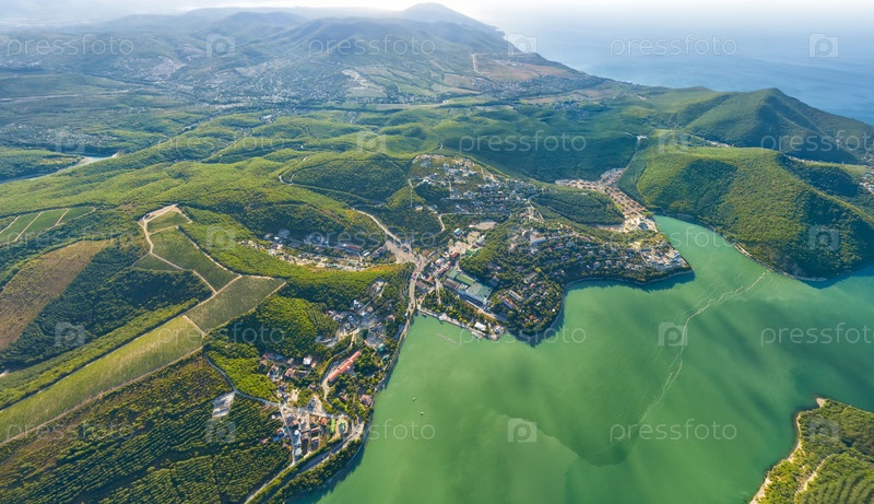 Абрау-Дюрсо, Россия. Вид на озеро Обрао, горы, Черное море и виноградники. Лето. С высоты птичьего полета