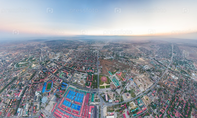 Грозный, Россия. Панорама города с воздуха после захода солнца. Синий час. С высоты птичьего полета
