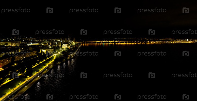 Саратов, Россия. Огни ночного города. Саратовский мост. Набережная реки Волги. С высоты птичьего полета