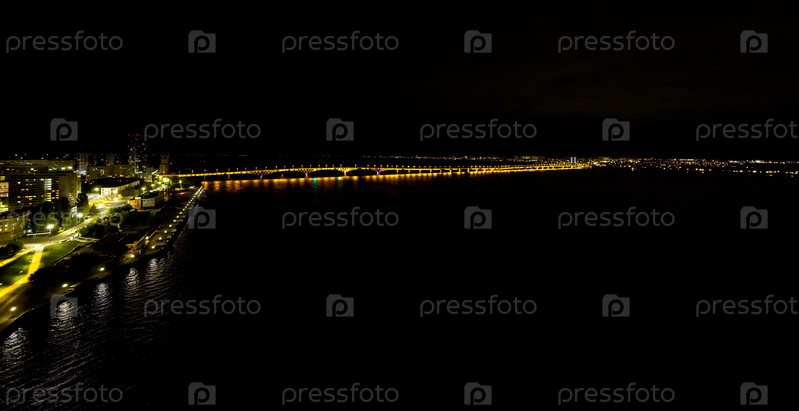 Саратов, Россия. Огни ночного города. Саратовский мост. Набережная реки Волги. С высоты птичьего полета