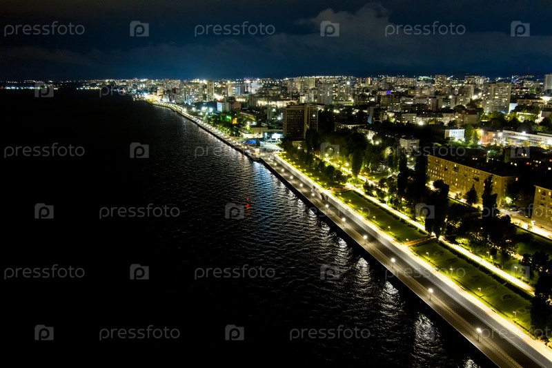 Саратов, Россия. Огни ночного города. Набережная реки Волги. С высоты птичьего полета