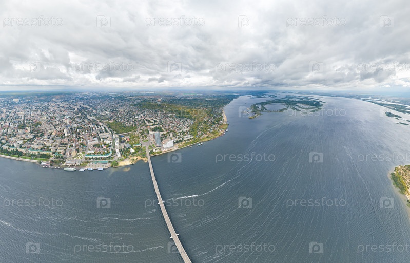 Саратов, Россия. Панорама города и Саратовского моста через Волгу. Облачная погода. С высоты птичьего полета
