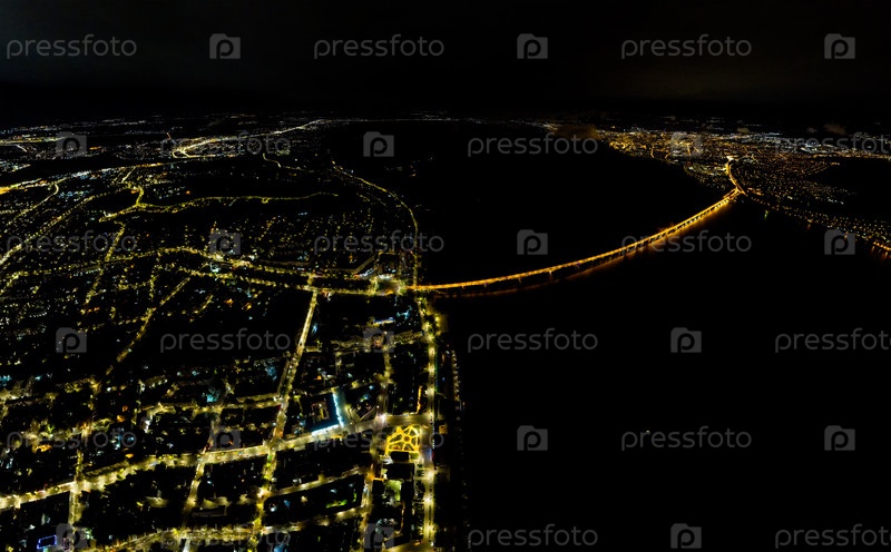 Саратов, Россия. Огни ночного города. Саратовский мост. Набережная реки Волги. С высоты птичьего полета
