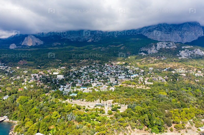 Алупка. Крым. Воронцовский дворец в свете яркого солнца. Лето. С высоты птичьего полета