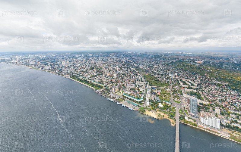 Саратов, Россия. Панорама города и Саратовского моста через Волгу. Облачная погода. С высоты птичьего полета