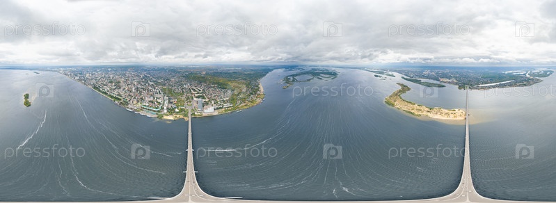 Саратов, Россия. Панорама города и Саратовского моста через Волгу. Мост соединяет Саратов и Энгельс. Панорама 360. Вид с воздуха