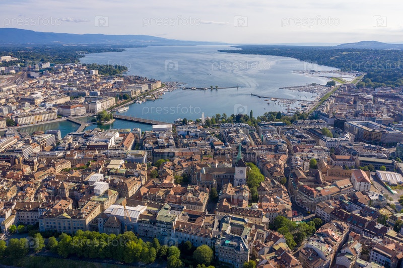 Женева, Швейцария. Женева, панорама с воздуха. Вид на Женевское озеро