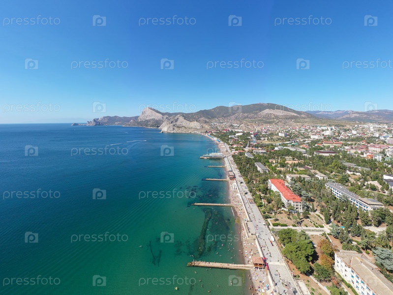 Судак, Крым. Генуэзская крепость. Вид на городские пляжи Судака со стороны Черного моря. С высоты птичьего полета