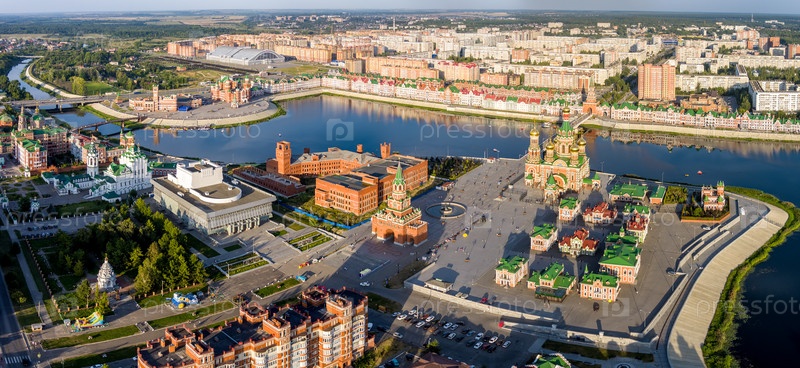 Йошкар-Ола, Россия. Панорама центра города во время заката. С высоты птичьего полета